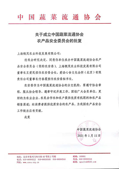 1月11日,經(jīng)過數(shù)月的準(zhǔn)備與醞釀,中國蔬菜流通協(xié)會正式批準(zhǔn)成立中國蔬菜流通協(xié)會農(nóng)產(chǎn)品安全委員會(簡稱農(nóng)安委,CVMA Farm Produce Safety Committee)。農(nóng)安委由上海概茂農(nóng)業(yè)科技發(fā)展有限公司承擔(dān)管理,其致力于提高國內(nèi)農(nóng)產(chǎn)品品質(zhì)、保障農(nóng)產(chǎn)品安全、開拓農(nóng)產(chǎn)品銷售渠道、為消費(fèi)者提供安全優(yōu)質(zhì)的農(nóng)產(chǎn)品。上海概茂農(nóng)業(yè)科技發(fā)展有限公司董事長王愛民任農(nóng)安委會長。為方便協(xié)會工作,農(nóng)安委秘書處設(shè)在愛語心舍文化會所(北京)有限責(zé)任公司,董事長付春霞擔(dān)任農(nóng)安委秘書長,主要負(fù)責(zé)農(nóng)安委日常工作。