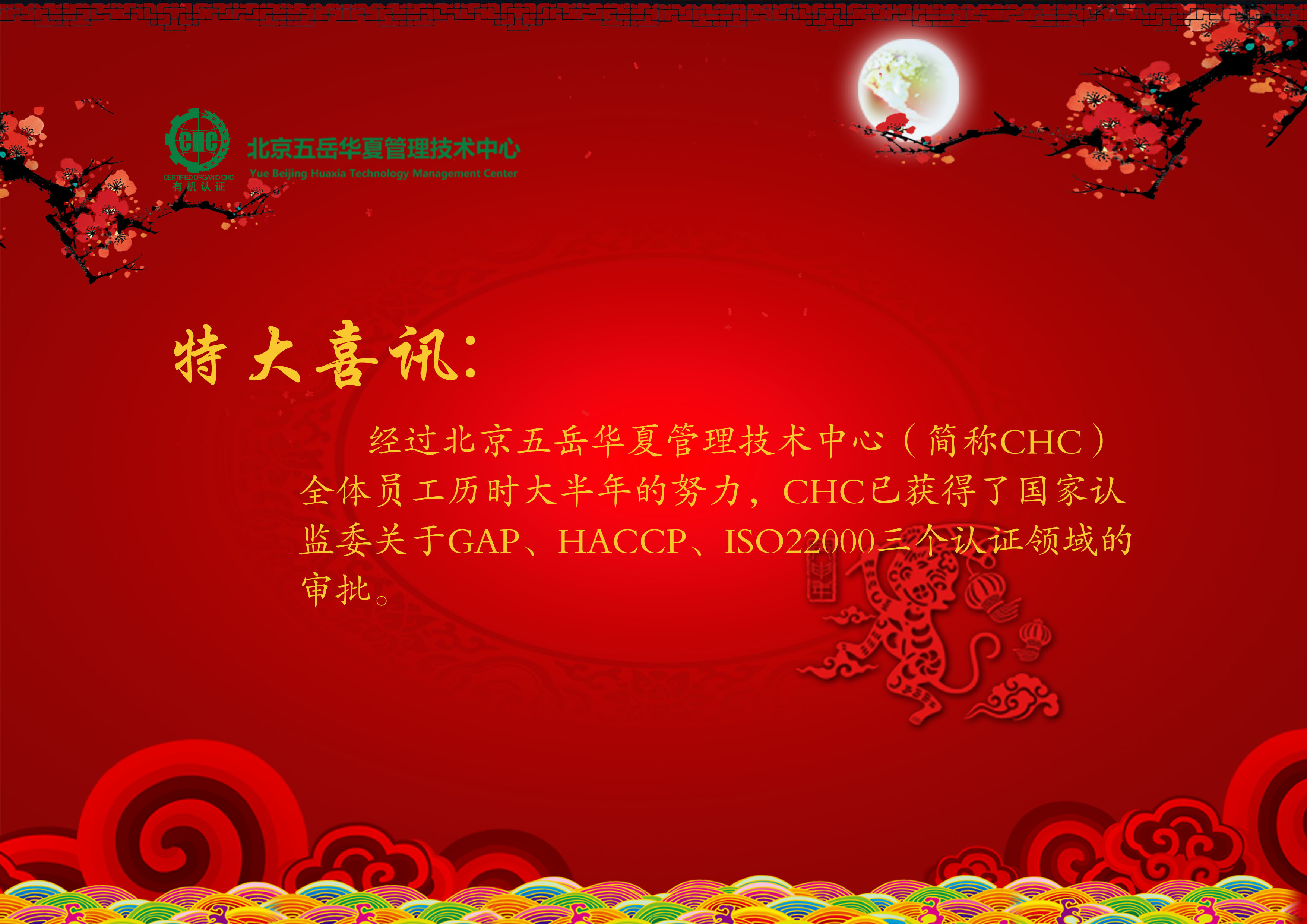 特大喜訊:經(jīng)過北京五岳華夏管理技術(shù)中心(簡(jiǎn)稱CHC)全體員工歷時(shí)大半年的努力,CHC已獲得了國家認(rèn)監(jiān)委關(guān)于GAP、HACCP、ISO22000三個(gè)認(rèn)證領(lǐng)域的審批。