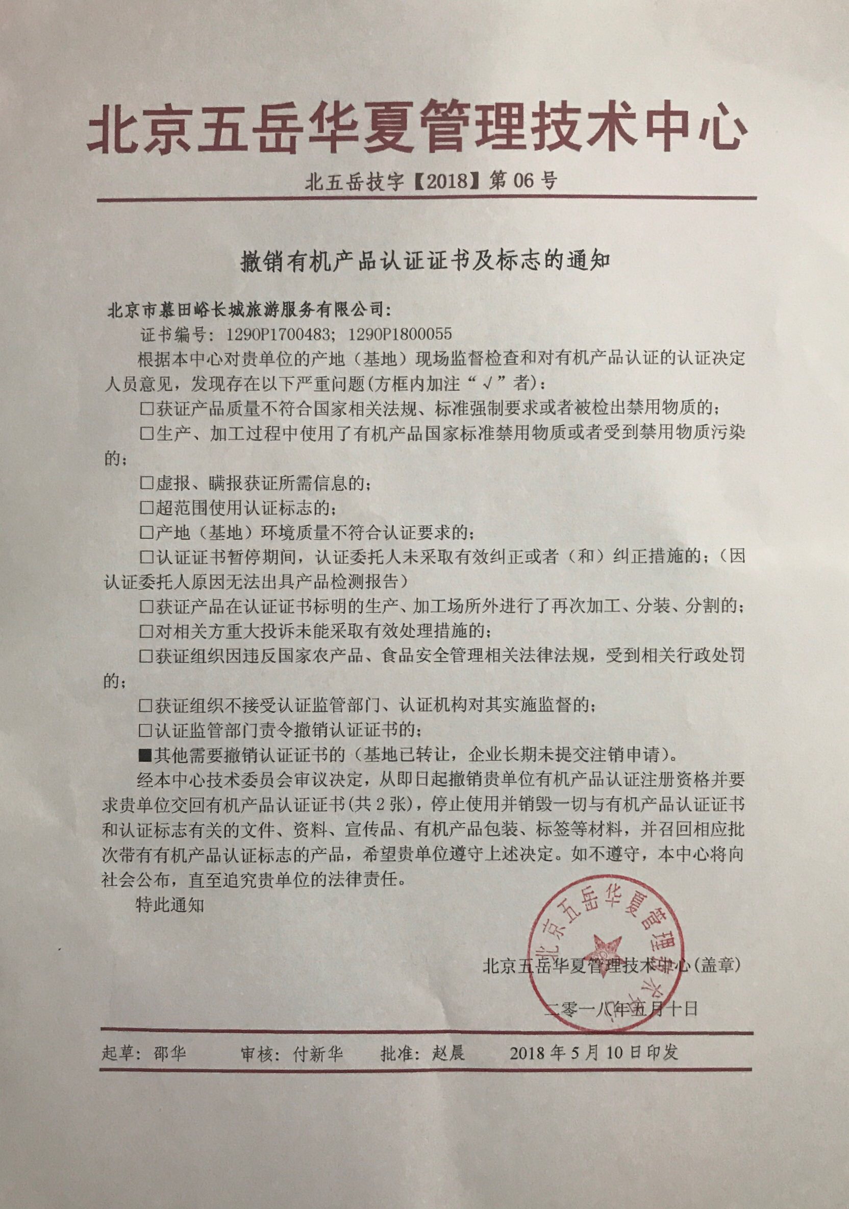 關于撤銷北京市慕田峪長城旅游服務有限公司有機產品認證證書及標志的通知