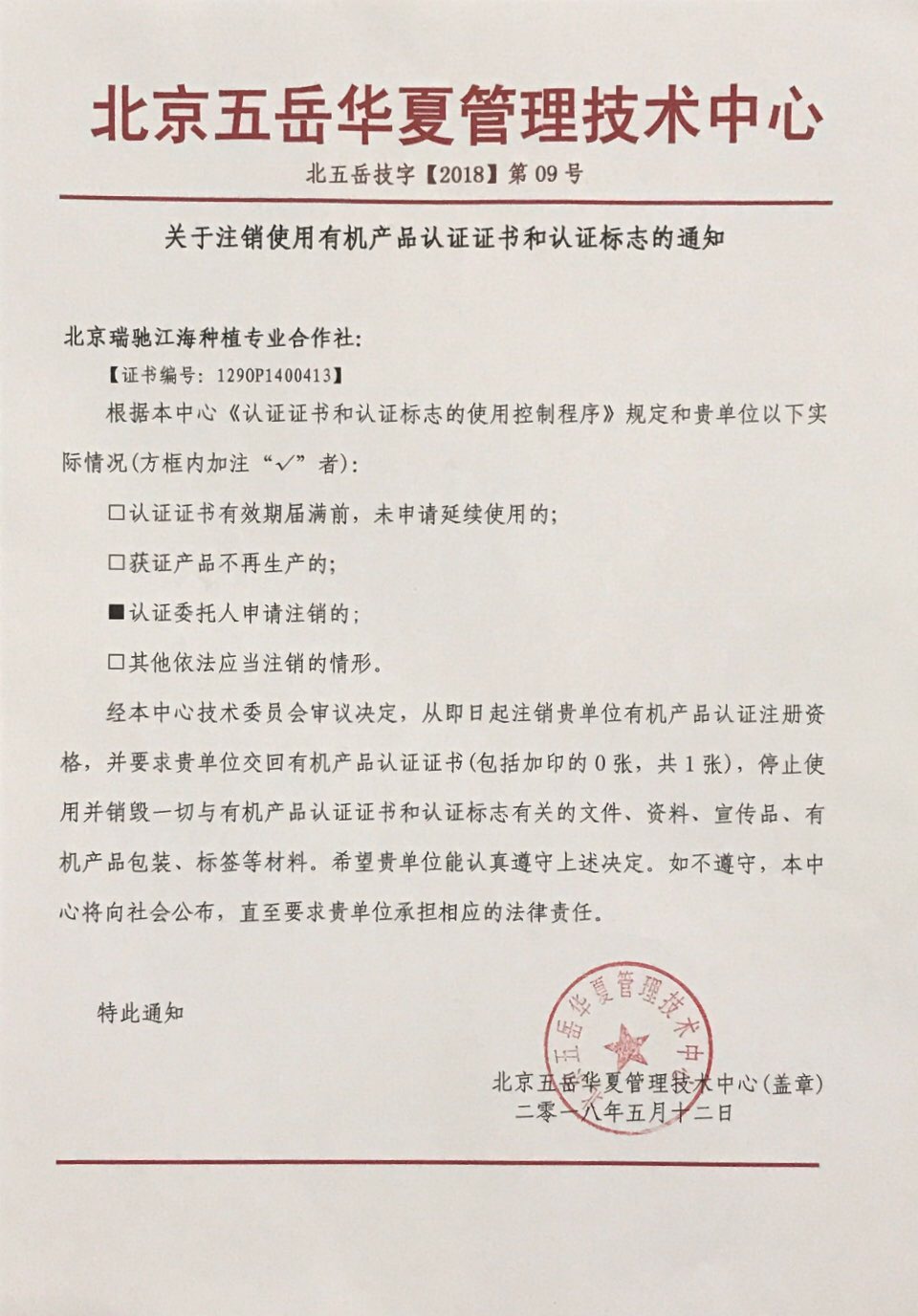 關于注銷北京瑞馳江海種植專業合作社有機產品認證證書和認證標志的通知