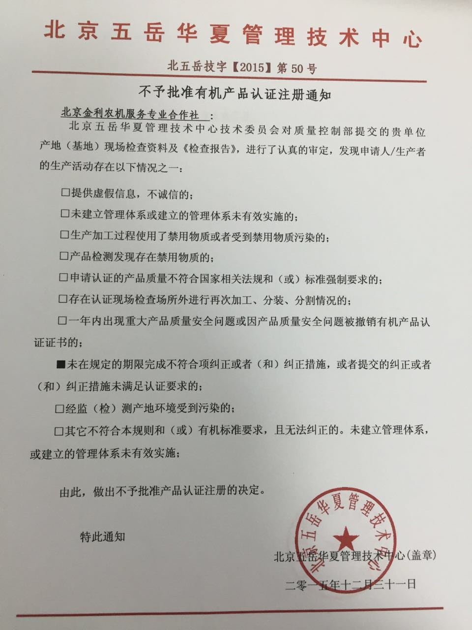 關于不予批準北京金利農機服務專業合作社有機產品認證注冊的通知