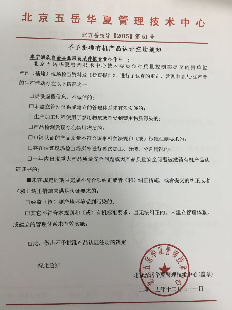 關于不予批準豐寧滿族自治縣鑫森蔬菜種植專業合作社有機產品認證注冊通知