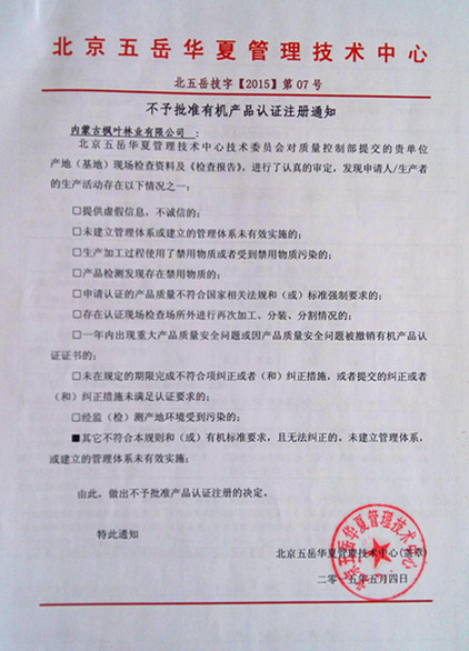 關于不予批準內蒙古楓葉林業有限公司有機產品認證注冊的通知