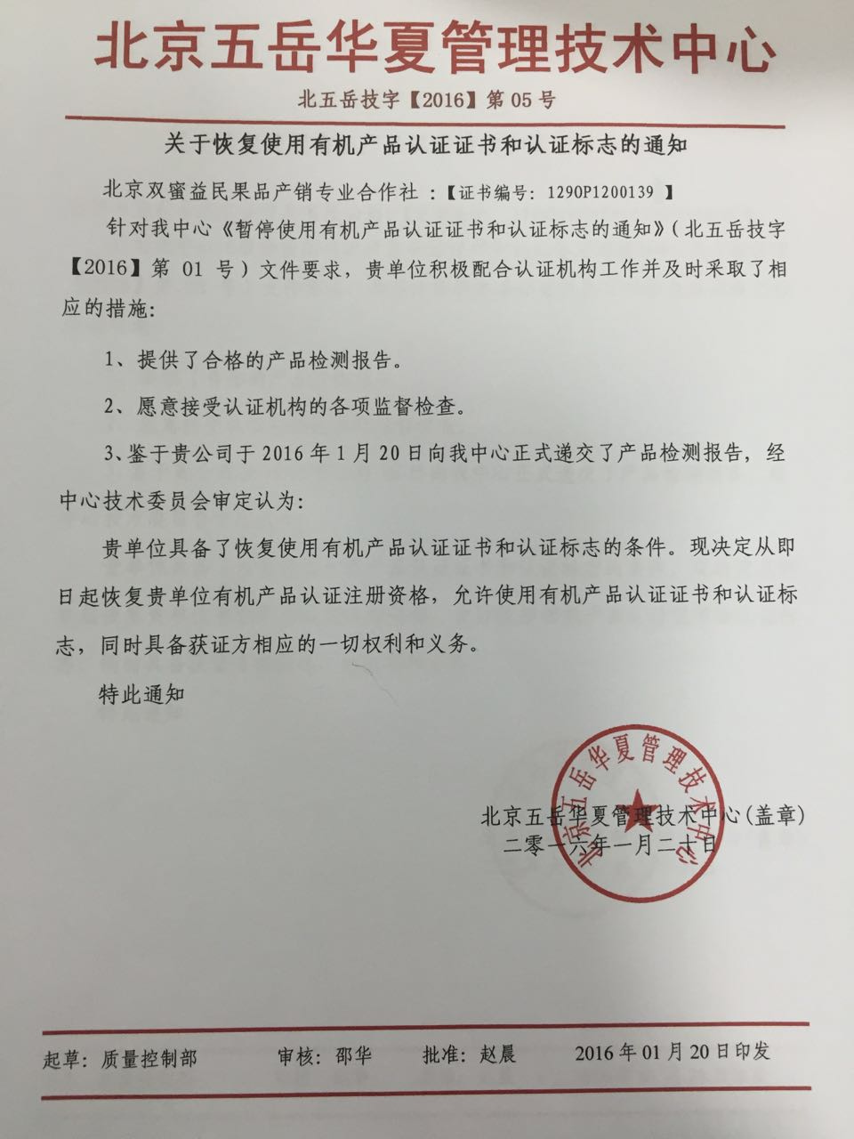 關(guān)于恢復(fù)北京雙蜜益民果品產(chǎn)銷專業(yè)合作社使用有機(jī)產(chǎn)品認(rèn)證證書和認(rèn)證標(biāo)志的通知