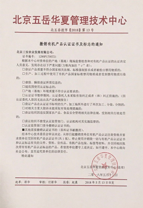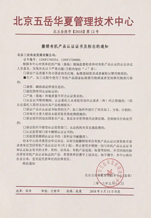 關于撤銷北京三安農業發展有限公司有機產品認證證書及標志的通知