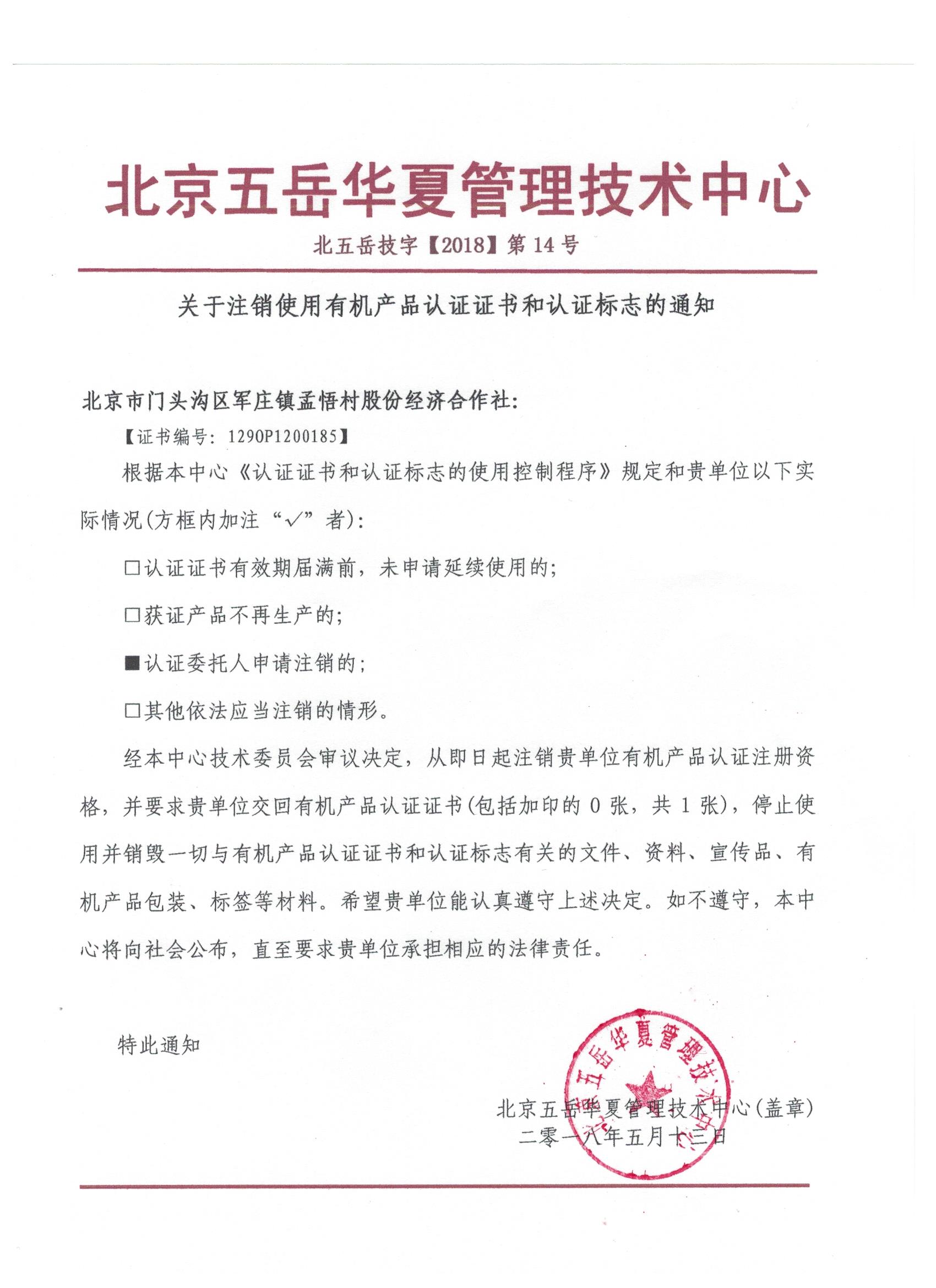 關于注銷北京市門頭溝區軍莊鎮孟悟村股份經濟合作社有機產品認證證書和認證標志的通知
