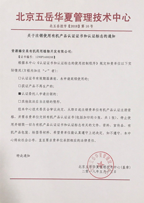 關于注銷資源臻安泉有機藥用植物開發有限公司有機產品認證證書和認證標志的通知