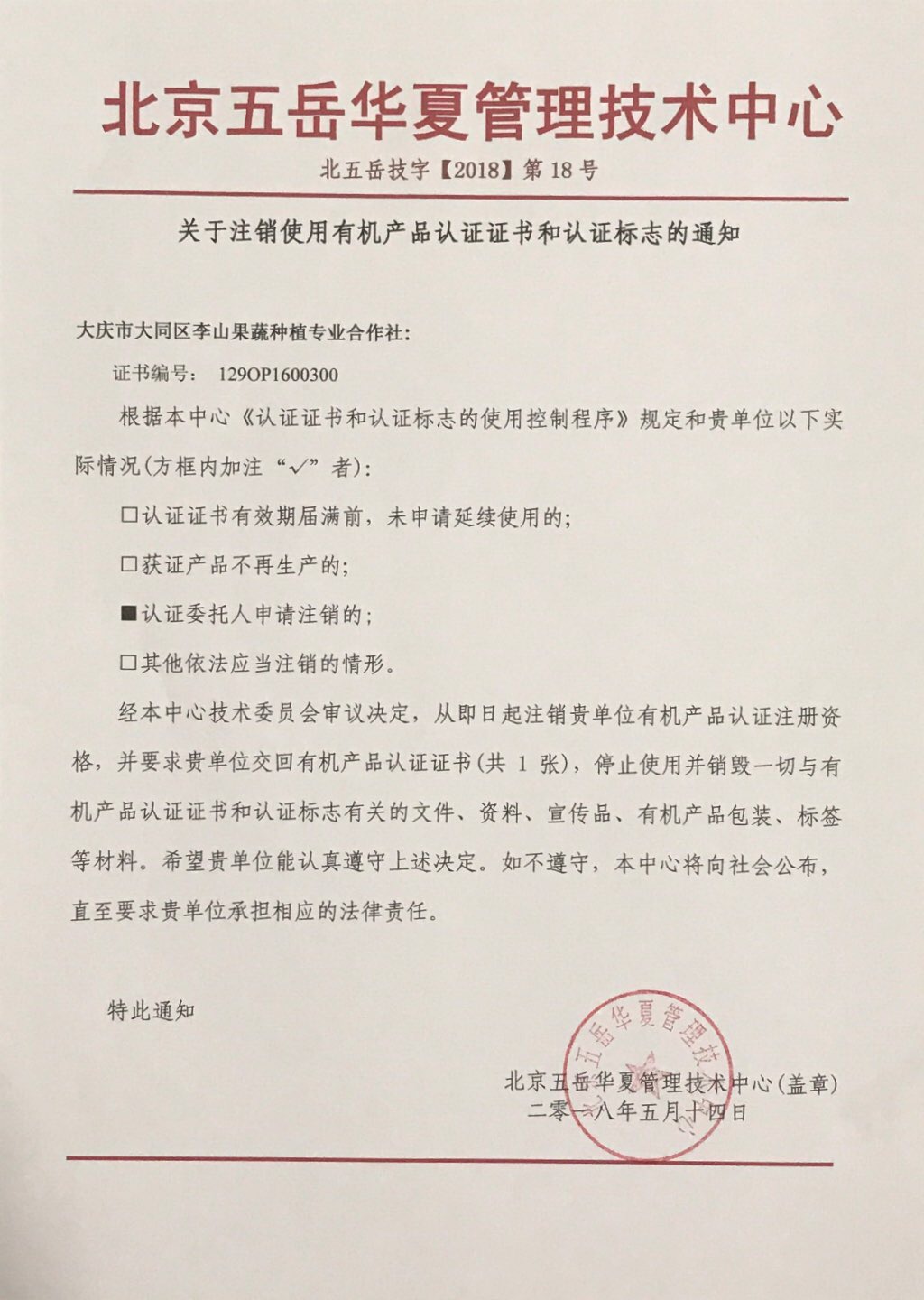 關(guān)于注銷(xiāo)大慶市大同區(qū)李山果蔬種植專業(yè)合作社有機(jī)產(chǎn)品認(rèn)證證書(shū)和認(rèn)證標(biāo)志的通知