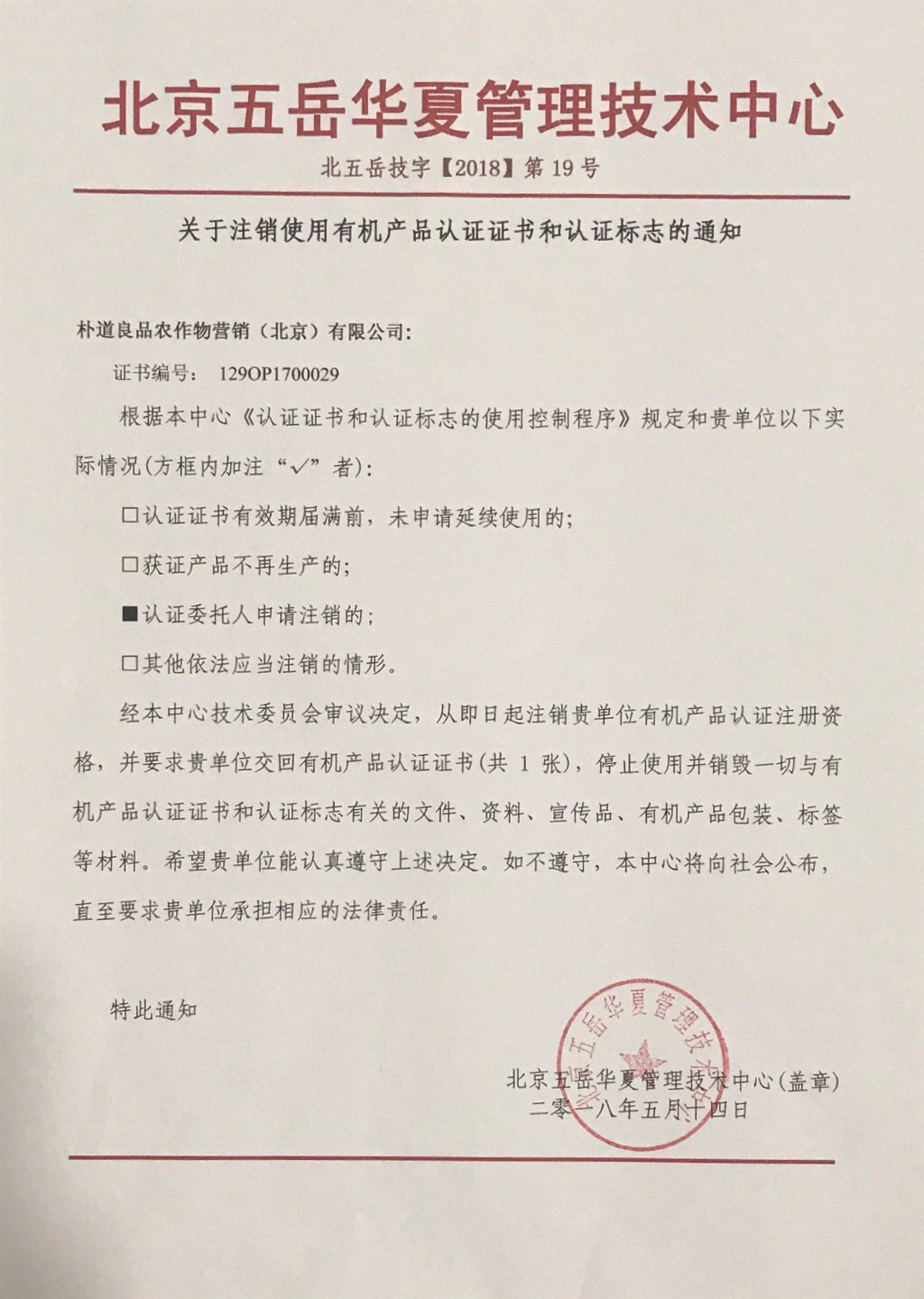 關于注銷樸道良品農作物營銷(北京)有限公司有機產品認證證書和認證標志的通知