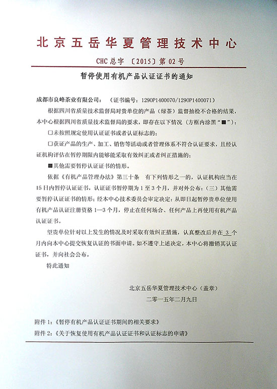 關(guān)于暫停使用有機(jī)產(chǎn)品認(rèn)證證書及標(biāo)志的通知