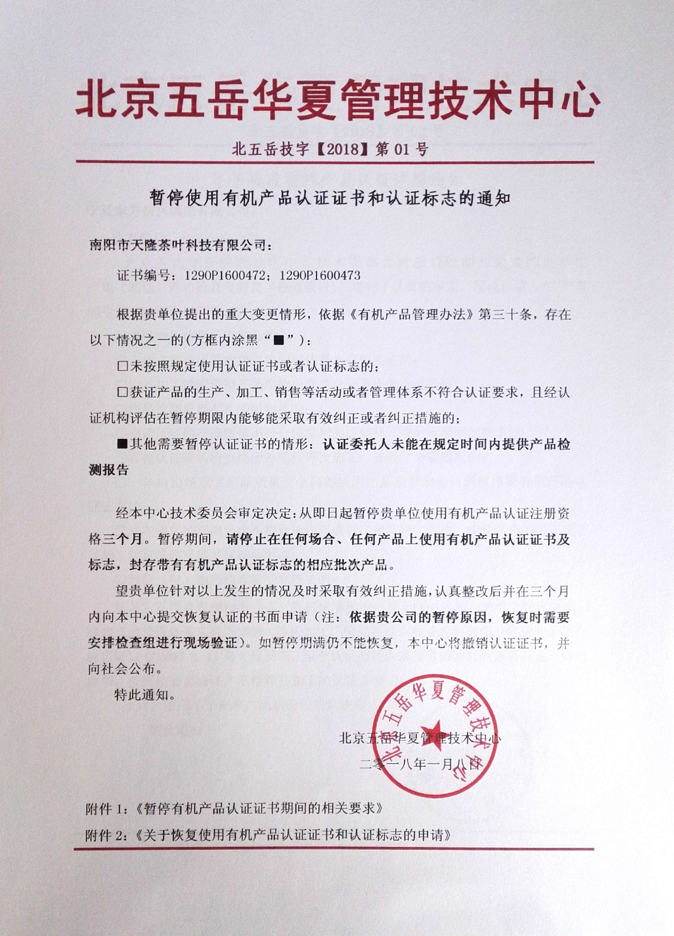 關于暫停南陽市天隆茶業科技有限公司有機產品認證證書和標志的通知