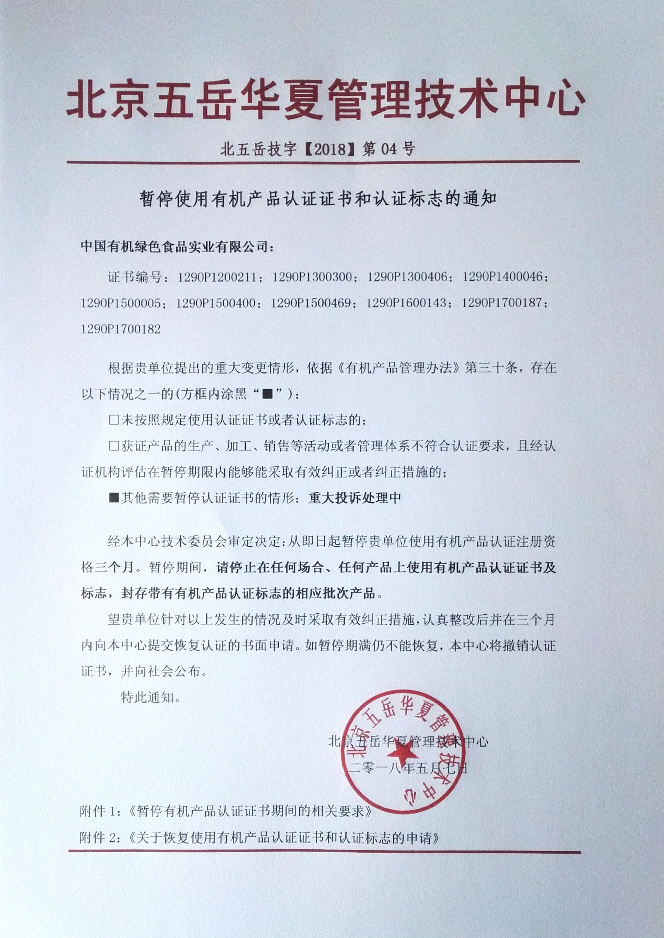 關于暫停中國有機綠色食品實業有限公司有機產品認證證書和認證標志的通知