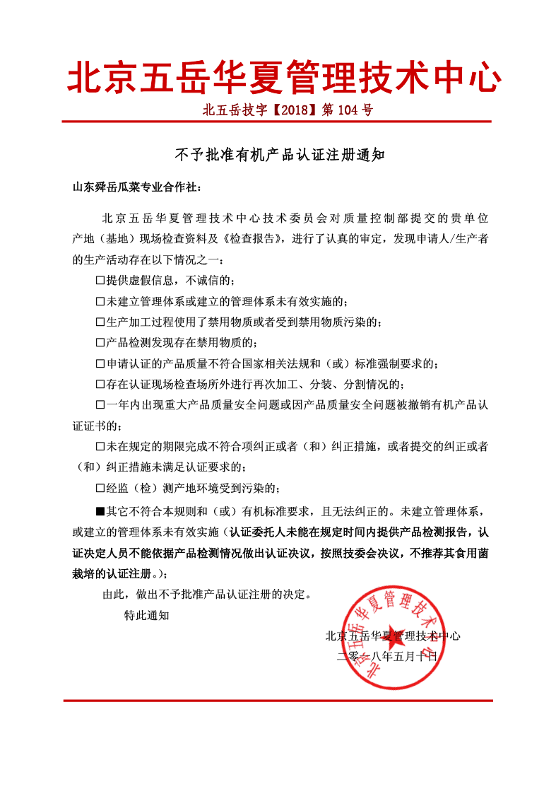 關(guān)于 不予批準(zhǔn)山東舜岳瓜菜專業(yè)合作社有機(jī)產(chǎn)品認(rèn)證注冊(cè)的通知